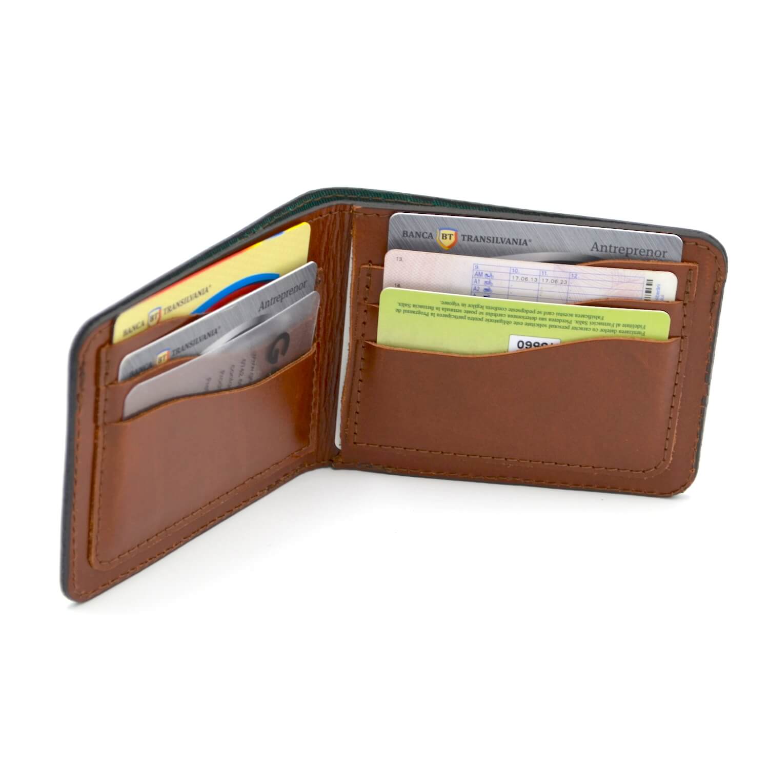 1 buzunar bancnote, 1 slot CI, 6 buzunare carduri |