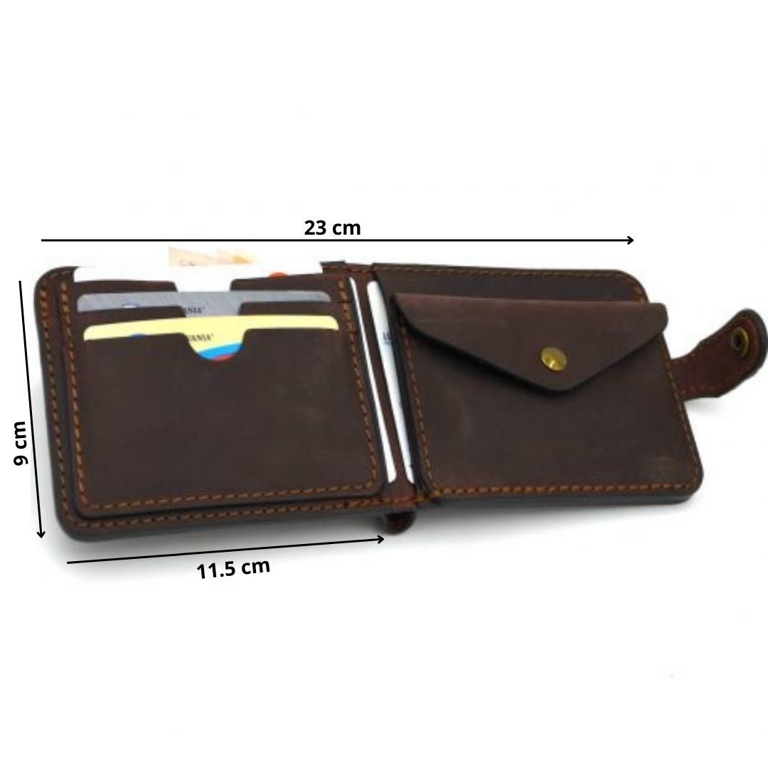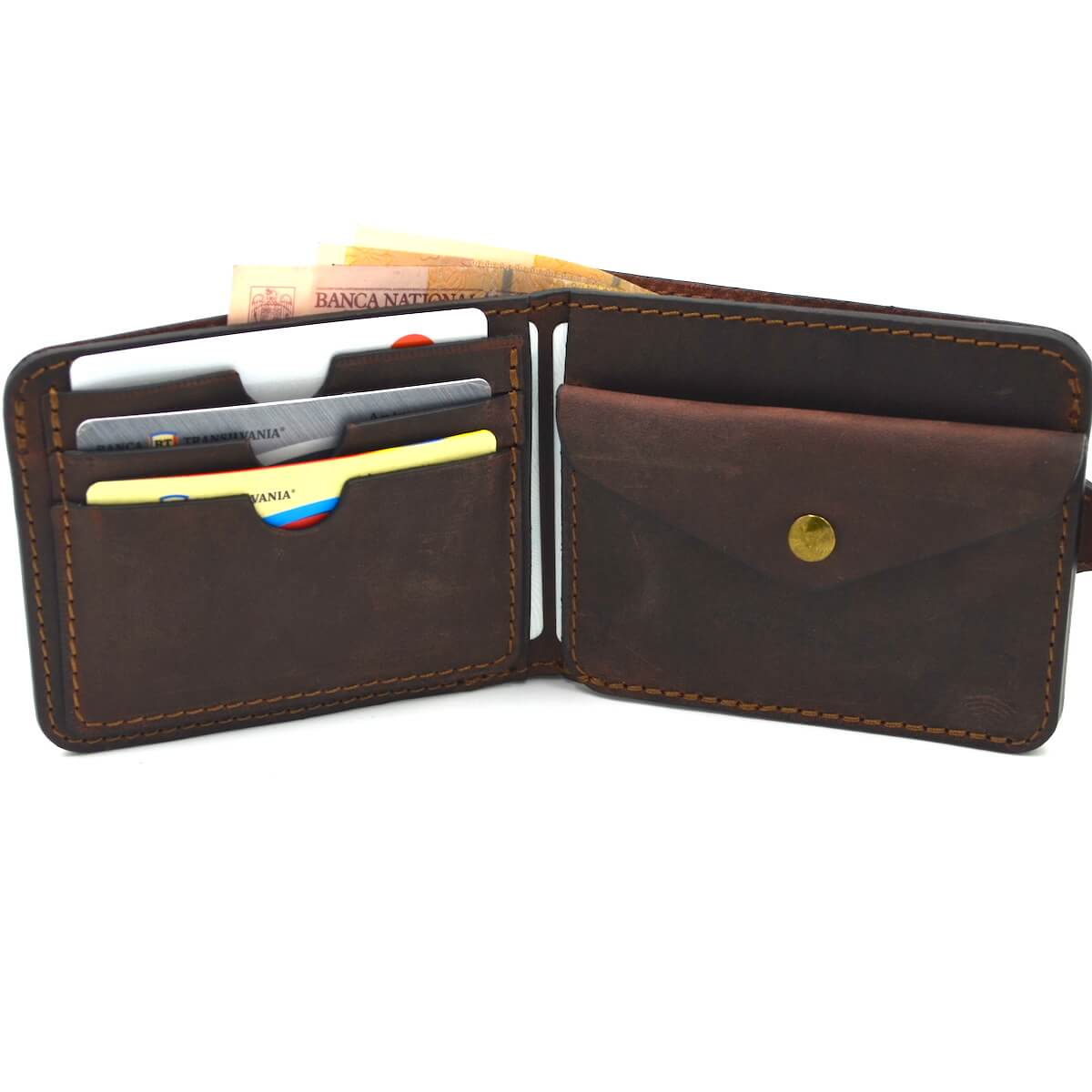 Men’s wallet, handmade, natural leather, antiqued, crazy horse brown and black. The wallet is compartmentalized with 3 internal pockets for cards, 1 pocket for banknotes, 2 pockets for bulletins and a compartment for coins. If they are not in stock, the wallets can be pre-ordered, their delivery time is 2-3 working days.